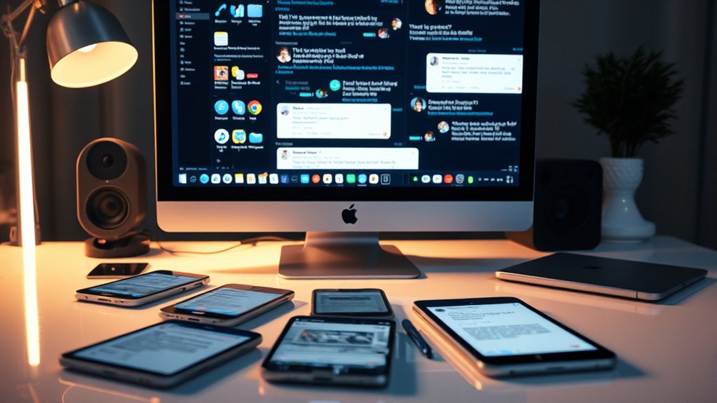 When you delete messages from one device, they usually stay on other devices due to messaging app limitations. This can raise privacy concerns because your messages might still be accessible elsewhere. To fully delete messages, you often need to delete them from all synced devices or use app-specific features. Remember, not all apps sync deletions instantly, so check your app’s privacy settings to guarantee your messages are truly gone everywhere.