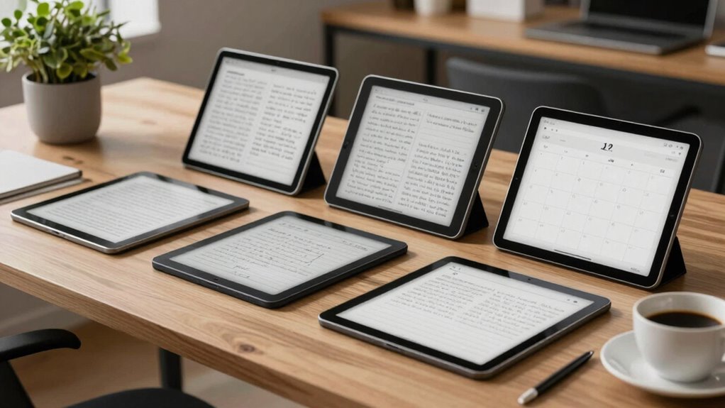 Imagine yourself scribbling effortlessly on a sleek e-ink screen, the world fading away as your thoughts flow. These tablets are your gateway to distraction-free journaling, where every stroke feels natural and focused. Whether you prefer the crisp clarity of the iFLYTEK AINOTE or the long-lasting battery of the X model, these devices turn your ideas into a calming digital journal. Embrace the simplicity and let your creativity breathe freely on these serene screens.