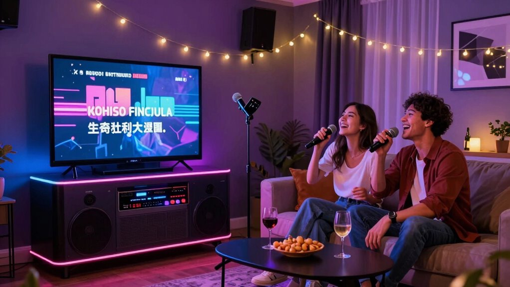 Did you know that over 60% of karaoke enthusiasts love singing in multiple languages? I’ve found many karaoke systems now offer extensive multilingual song selections, making it easier to sing your favorite tunes regardless of language. I recommend checking out models with built-in global libraries or streaming options, so you can enjoy a diverse playlist. This way, your date night can be lively and inclusive, no matter what language you prefer.